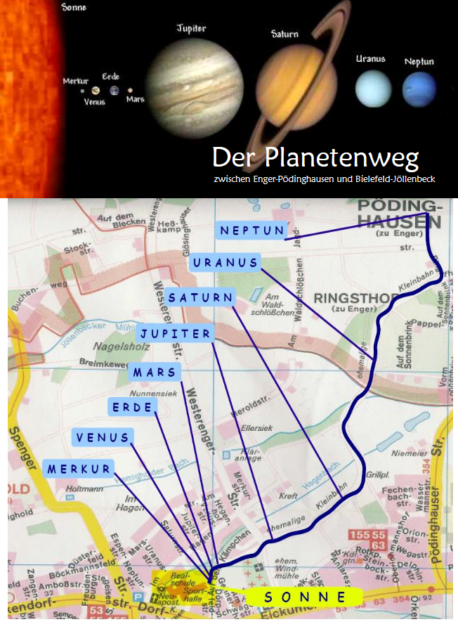 Den Anfang bildet das Informationsschild des Neptuns an der höchstgelegenen Stelle Engers, von der man einen herrlichen Blick auf das Land zwischen Teutoburger Wald und Wiehengebirge genießen kann. Über eine 3 km lange Strecke geht es dann von Planet zu Planet immer näher heran an die Sonne, die sich am roten Anbau der Realschule Jöllenbeck befindet. Der Weg ist gut ausgeschildert und auch mit Kindern begehbar, Bänke und ein Spielplatz laden unterwegs zu einer Pause ein.
